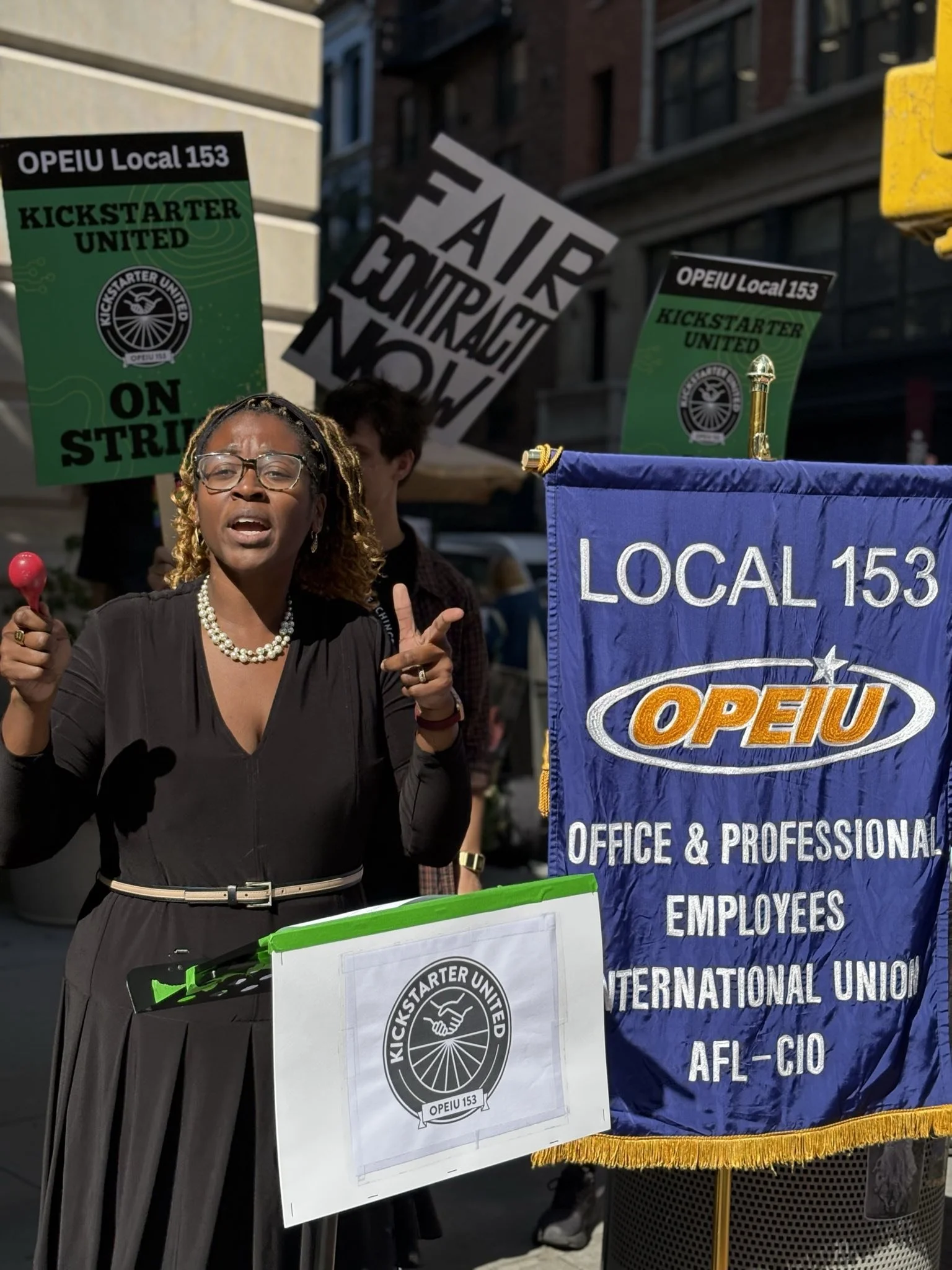 (New York, NY) – In a show of solidarity, nearly 50 union workers, including Kickstarter United (KSRU), rallied and picketed with Elected Officials and leaders from OPEIU Local 153, New York Times Tech Guild and NYC Central Labor Council outside of Kickstarter Board Member and Investor Fred Wilson's venture capitalist firm, Union Square Ventures. The picket comes just days after KRSU’s strike began on Thursday, October 2nd after management failed to offer a fair contract. Kickstarter workers are represented by the Office and Professional Employees International Union (OPEIU) Local 153. The key issues that remain unresolved: protecting Kickstarter’s existing four-day, 32-hour workweek and establishing a minimum salary that provides a livable wage.